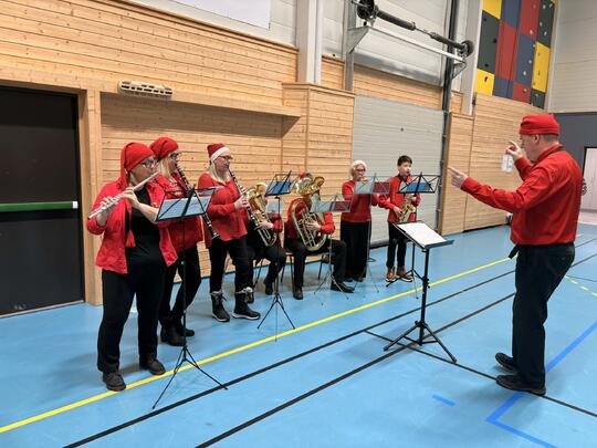Herøy Musikkorps sørget for julestemning med kjente julesanger under juletregangen i aulaen. Roar Danielsen og Rolf Jørgensen bidro som forsangere.
